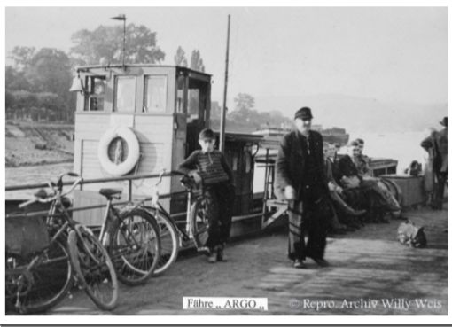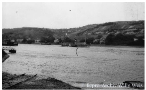 "Blick auf den Rhein“ vom Kripper Ufer aus. Links die Bootswerft der Fährgesellschaft. Repro Archiv Willy Weis