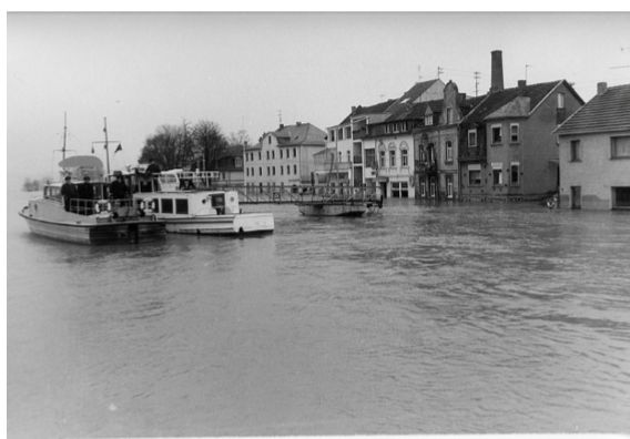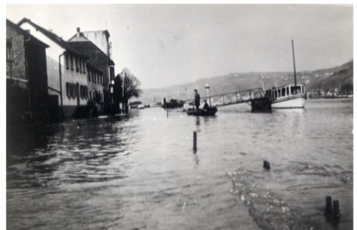 Foto: Fotosammlung Traditionsverein Kripp "J. v. Keller“ oder ”Egon von Fürstenberg“ (I) beim Hochwasser 1925 / 1926 am Steiger in Kripp (Im Hintergrund: die Gierponte