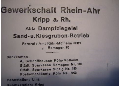 12) mündl. Angaben Balthasar Wahl +, Kripp 13) Nach mündlichen Angaben des Zeitzeugen Michael Schumacher, * 1902 Kripp 14) mündl. Angaben Balthasar Wahl +, Kripp 15) wie Nr.14 16) LHKo 441/23979 17) Dachverband der Steineindustrie Essen, Infobroschüre :"Ziegel"- Ein Ziegel, was