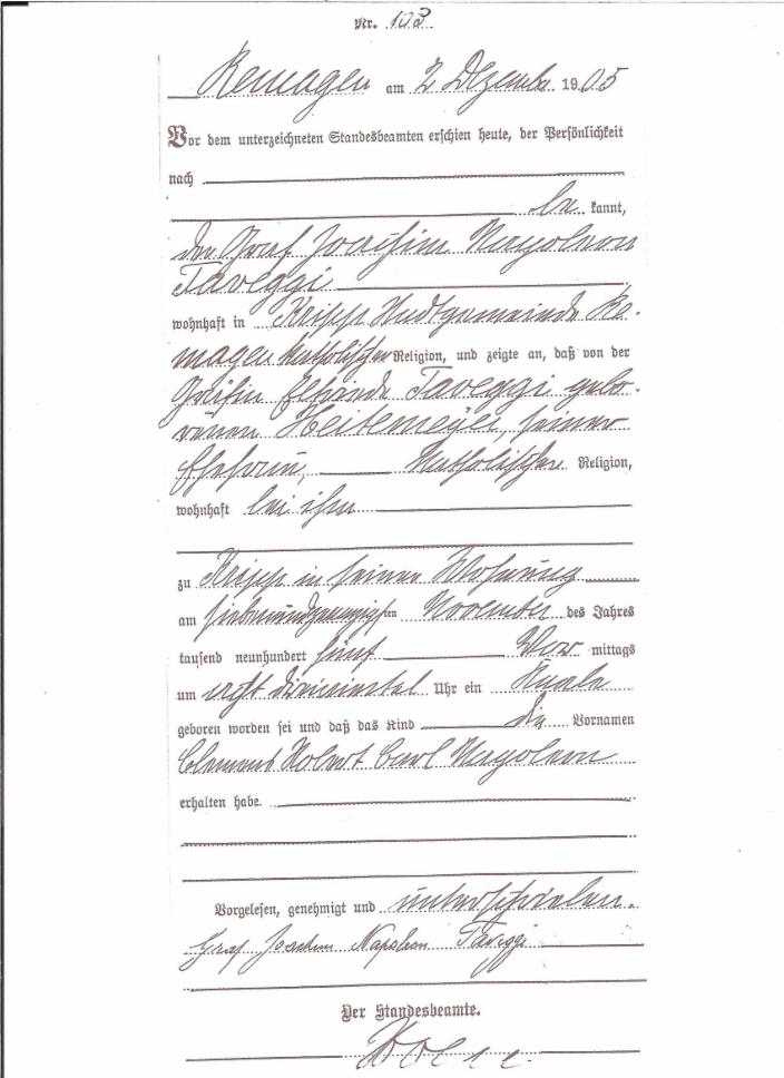 Im Jahre 1905 wurde das zweite Kind der Taveggis in Kripp geboren. Sein Name Clement, Robert, Carl, Napoleon. Der Rufnahme des kleinen Grafen war Robert und später wurde er in Kripp bekannt unter dem Namen Bobby. Die Geburtsurkunde von Robert, ausgestellt von der Stadtgemeinde Remagen am 2. Dezember 1905